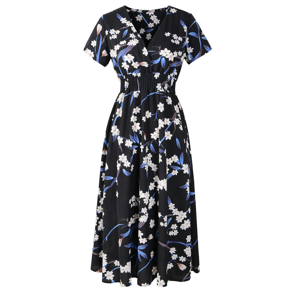 Beauty Chiffon Beach Dress Print V Neck Short Sleeve Dress