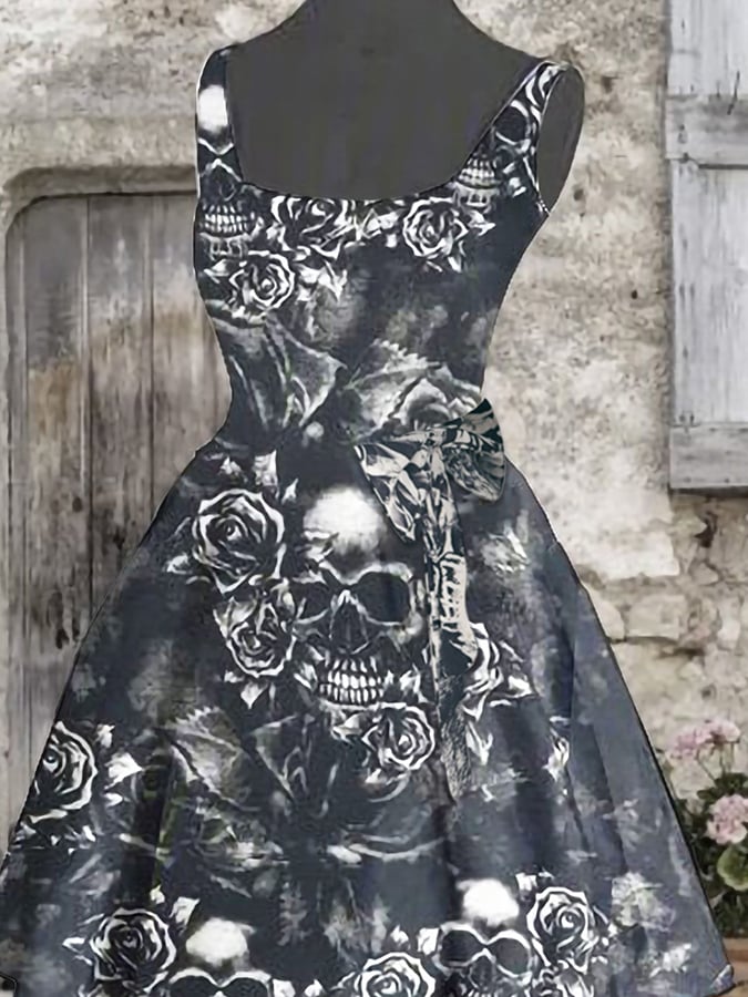Goth Sleeveless Swing Skull Print Dress(Skirt without skirt support)