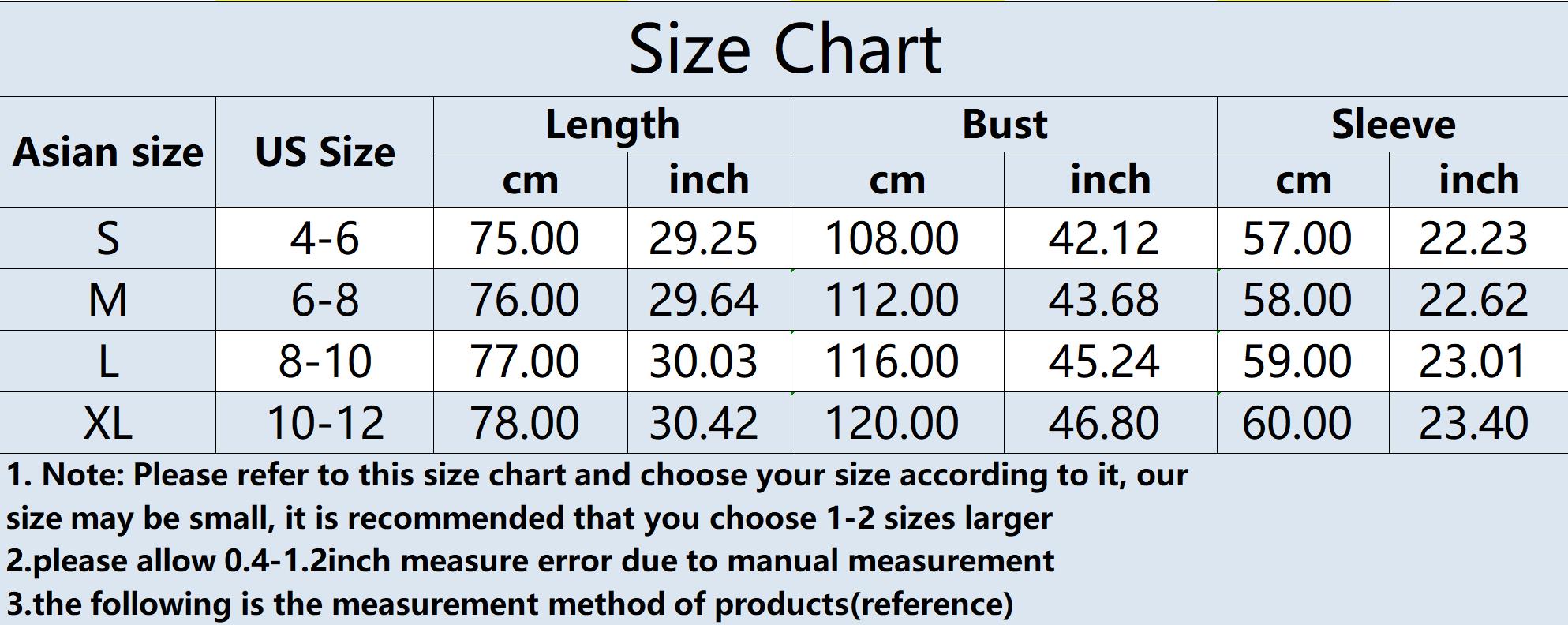 | Asian size | US Size | Length | Bust | Sleeve | |||