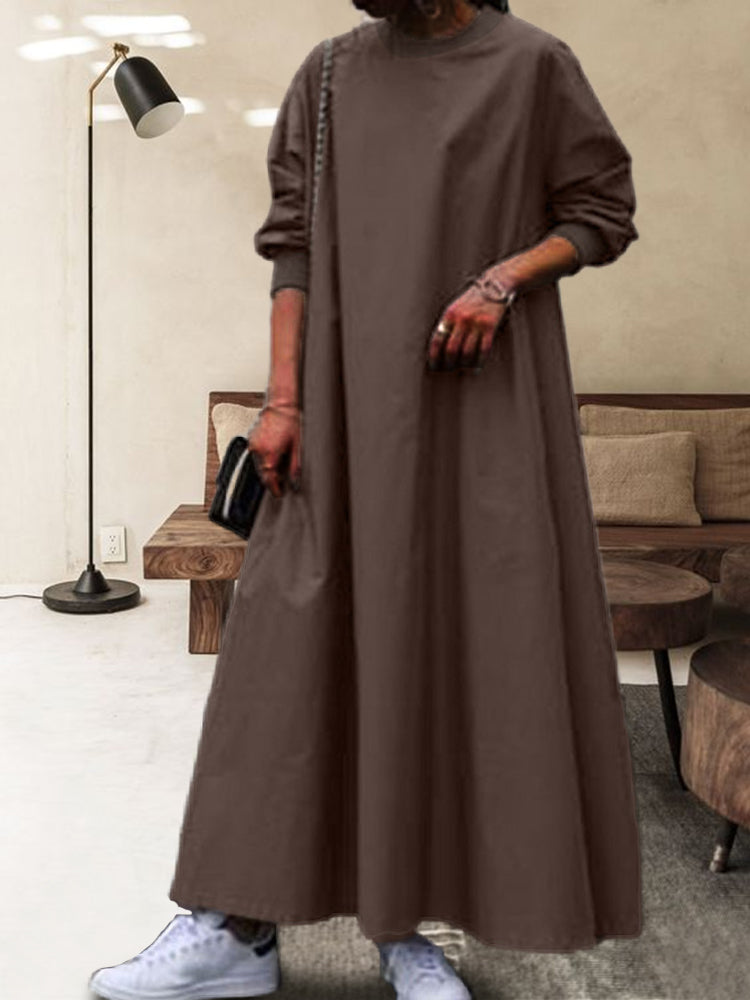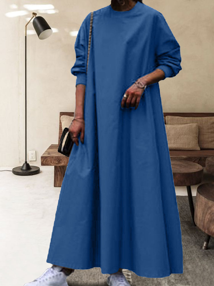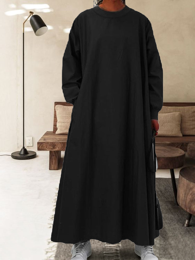 Describe-Loose Plus Size Round Neck Ribbed Long Sleeve Long Cotton And Linen Dress