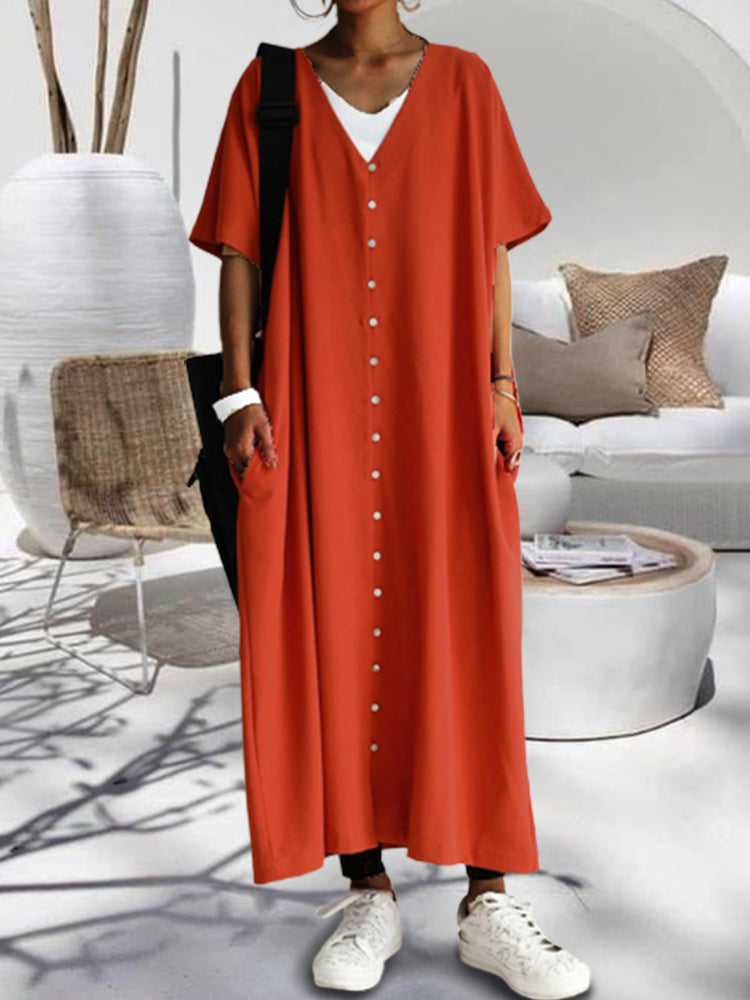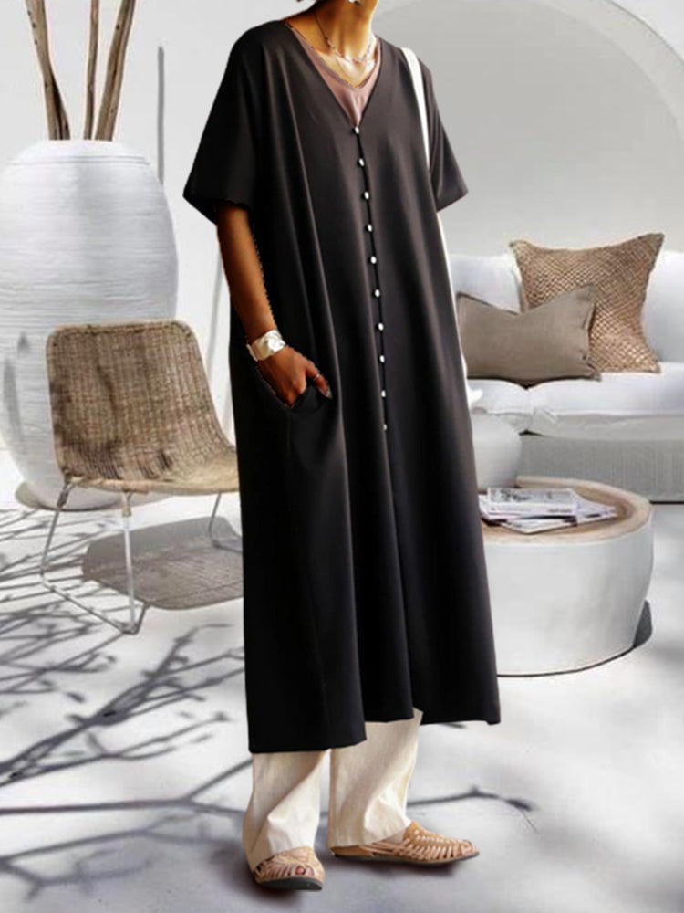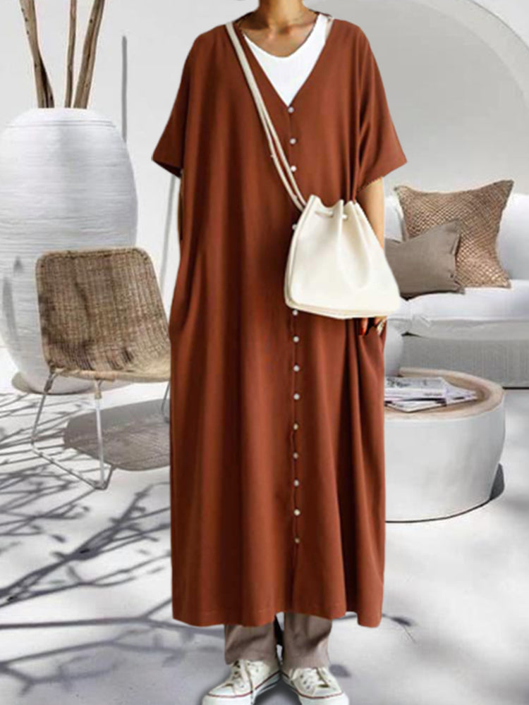 Describe-Short Sleeve V-Neck Loose Dress Shirt Long Dress