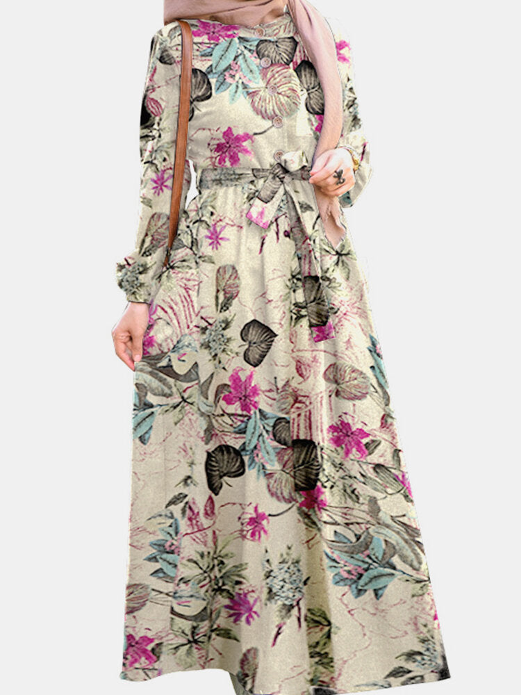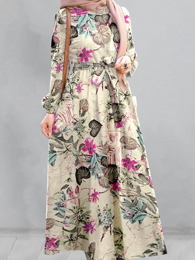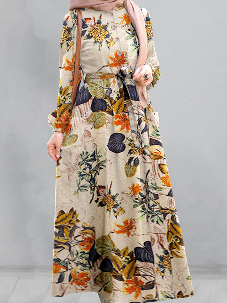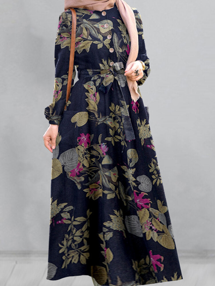 Vintage Flower Puff Sleeves O-neck Maxi Dress With Side Pocket