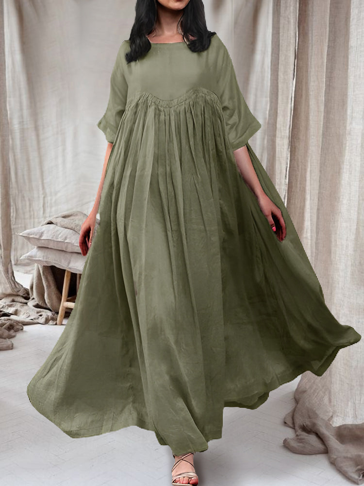 Cotton Linen Pullover Round Neck Large Swing Solid Color Dress