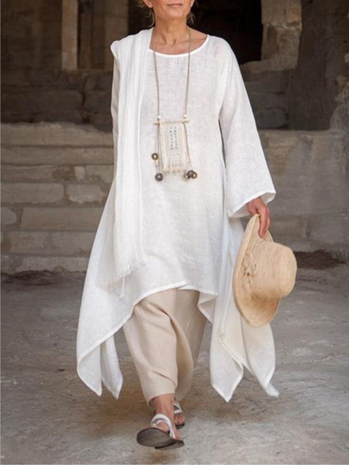 Vintage Asymmetric Long Sleeve Crew Neck Linen Plus Size Dress