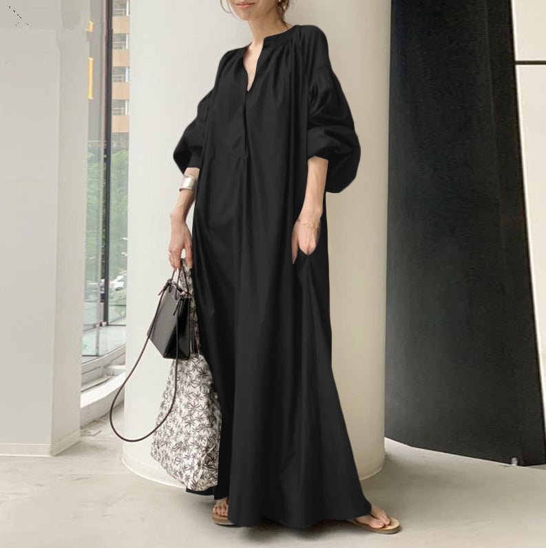 • Cotton Linen Stand Collar Long Loose Fashion Casual Lantern Sleeves Swing Dress