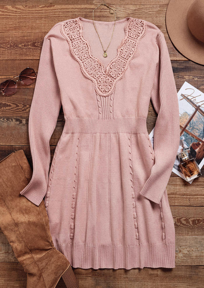 Lace Splicing Crochet Long Sleeve Sweater Mini Dress - Pink