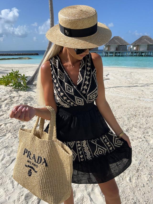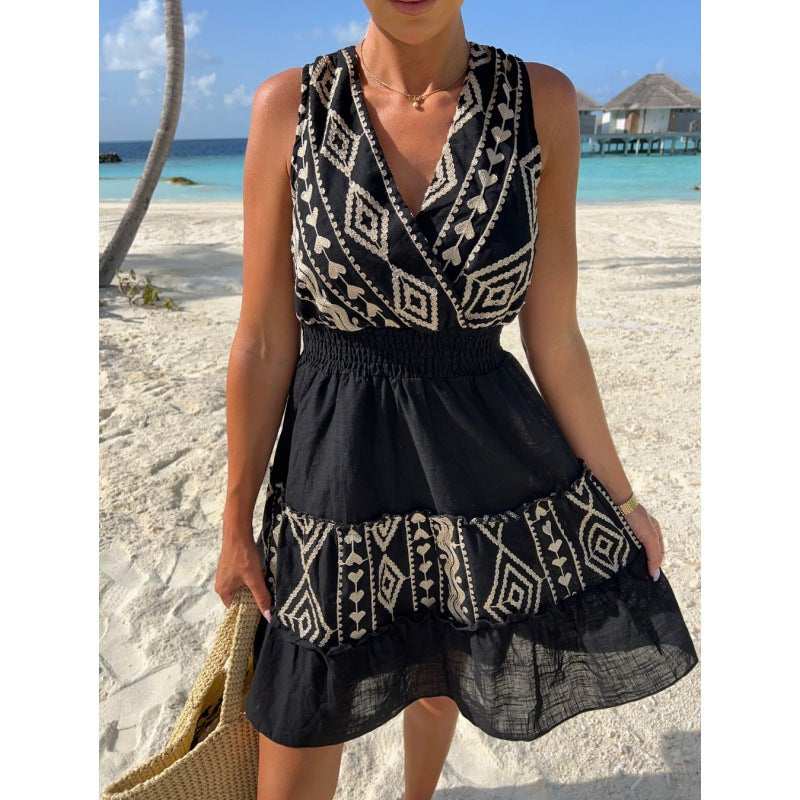 V-Neck Sleeveless Neck Waist Embroidered Print Dress